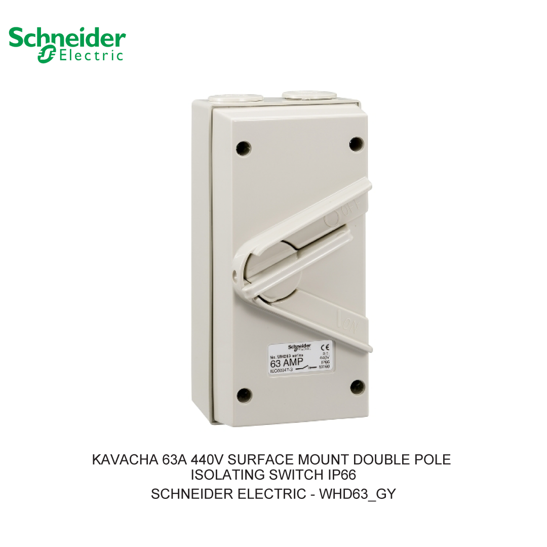 Untuk unduh datasheet produk WHD63_GY KAVACHA 63A 440V SURFACE MOUNT DOUBLE POLE ISOLATING SWITCH IP66, silahkan klik di sini! Karakteristik Teknikal: