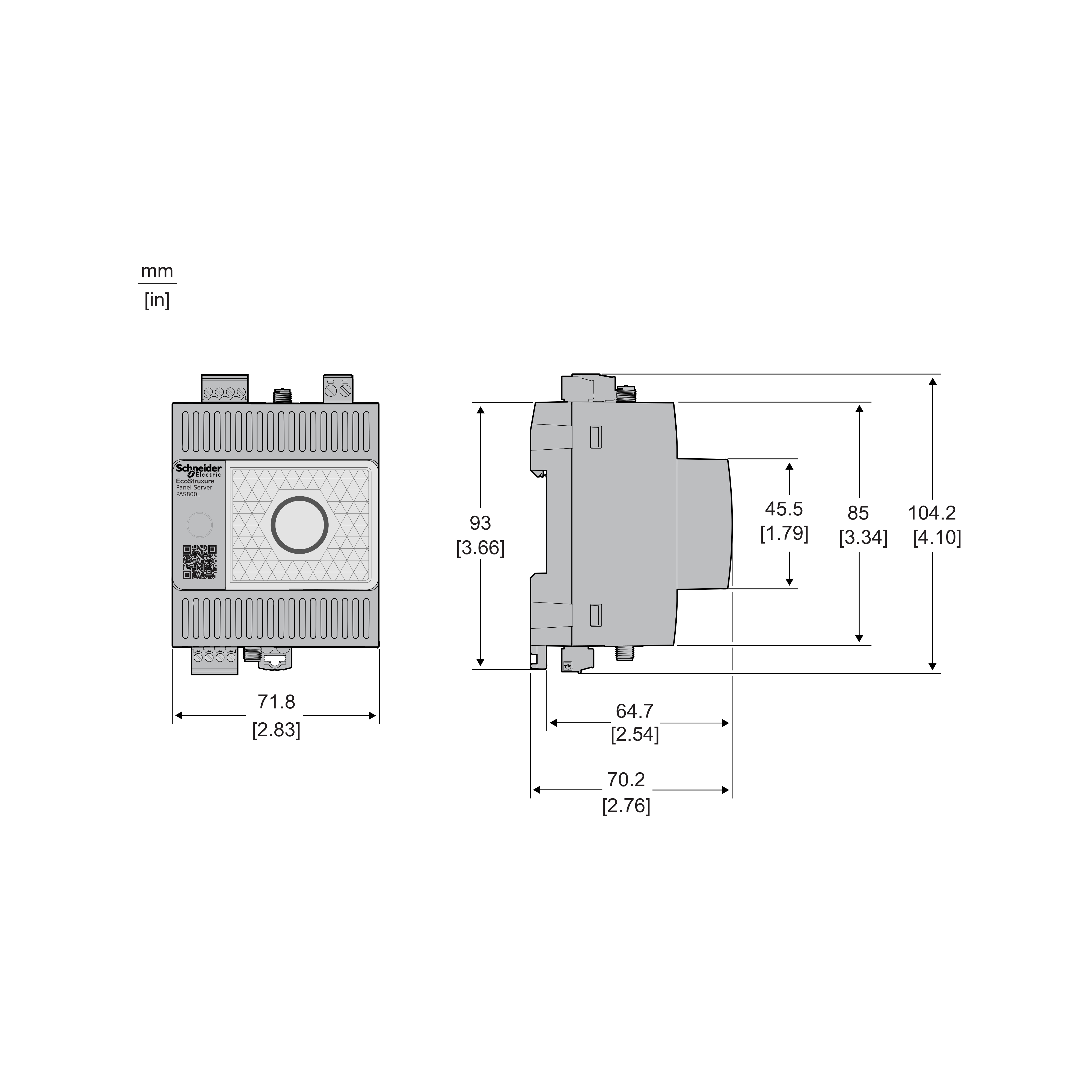 EcoStruxure Panel Server is a gateway, providing connection of wired or unwired smart IoT devices to edge control software or cloud application. Connect wireless devices from Schneider Electric such as PowerTag Energy, PowerLogic HeatTag, Power Tag Ambiant, Power Tag control and others. Connect most of Modbus/RS485 and Modbus/TCP devices from the market including PowerMeters and Protection devices from Schenider Electric. Three years data-logger with user friendly web-pages offering energy dahsboarding, trending analysis of the measurements and view of logged alarms. Simple troubleshooting or the sytem through embedded web-pages with advanced diagnostic informations and logs . Easy commissioning through embedded web-pages or with EcoStruxure Power Commissionig that will offer commissioning reports and advanced features. Product dimensions are as follows: width 71,8 millimetres, depth 70,2 millimetres and height 85 millimetres. 24VDC Power Supply 3W Max. -25°C to +70°C Operating temperature. 5-95% relative humidity. Major certifications including CE, UL/CSA, IEC61010, UL61010, IEC61974-1, Marine certification, IEC61443-4-2, RCM, EAC and UKCA. The gateway can be DIN rail mounted in a modular enclosure. It has IP20 connectors, IM40 front face nose and IP30 on others faces. Two 10/100 Base-T ethernet RJ45 connectors. Modbus RS485 open-style connector. Connector for external Wi-Fi/Bluetoth antenna. Connector for external antenna for wireless devices. Two connectors for Wi-Fi/Bluetooth external antenna and wireless devices external antenna. Connector for two Digital Inputs for dry contact or WAGES. Direct cellular connection through external LTE router connected through Ethernet or Wi-Fi. Perfect fit for EcoStruxure Edge Software such as Power Monitoring Expert, Power Operations and EcoStruxure Building Operations. Designed for EcoStruxure Cloud Applications such as Facility Expert, Asset Advisor and Resource Advisor. Specification