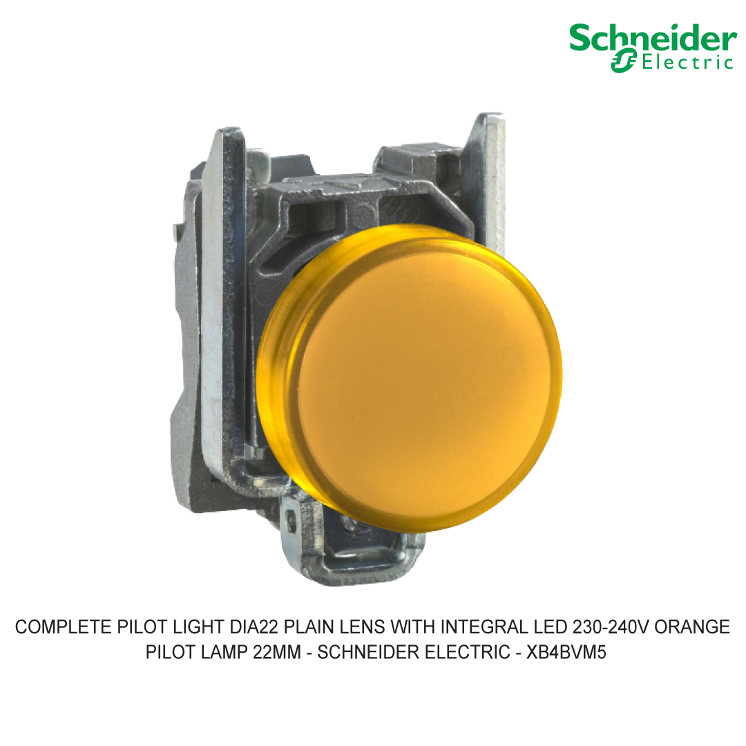 Untuk unduh datasheet produk XB4BVM5 COMPLETE PILOT LIGHT DIA22 PLAIN LENS WITH INTEGRAL LED 230-240V ORANGE, silakan klik di sini! Untuk unduh datasheet produk Pilot Lamp, silakan klik di sini! Pilot Lamp Schneider Electric Pilot lamp adalah sebuah lampu indikator yang bisa membantu dalam mengetahui ada tidaknya aliran listrik yang masuk pada bagian panel listrik. Pilot Lamp digunakan pada panel, jika terdapat aliran listrik yang masuk maka lampu pada pilot lamp akan menyala. Pilot Lamp tersedia dengan berbagai macam warna, tentunya warna digunakan sebagai tanda dan fungsi yg berbeda-beda dari pilot lamp tersebut. Fungsi Pilot Lamp :