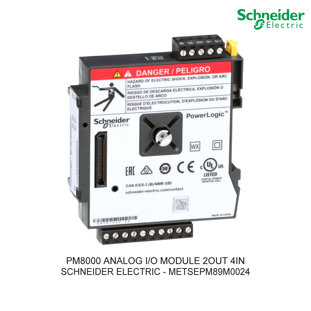 PowerLogic™ PM8000 Power Quality Meters Schneider Electric Dirancang untuk memantau dan menganalisis kualitas daya dan penggunaan energi pada aplikasi komersial dan industri, PowerLogic PM8000 adalah pengukur kualitas daya performa tinggi dengan tangkap gelombang, analisis harmonik, dan pemantauan kepatuhan untuk pengukuran yang akurat dan andal. Dengan teknologi ION™ yang dipatenkan dan terintegrasi dalam pengukur, produk ini memberikan fungsi pra-konfigurasi dan mudah disesuaikan. Anda dapat berbelanja dengan aman di ListrikKita.com karena semua barang yang kami jual dijamin 100% asli, bergaransi resmi, dan dapat disertai dengan surat keaslian barang. Untuk informasi lebih lanjut atau ingin melakukan pembelian dalam jumlah besar bisa menghubungi tim sales atau marketing kami, dengan klik di sini. Selamat berbelanja! Optional Input Output module compatible with PowerLogic PM8000, ION7400 and ION9000 devices that provides additional analog inputs and analog outputs. This analog module provides 4 analog inputs that support 0 to 20mA, 4 to 20mA and 0 to 30V. Plus 2 analog outputs to interface with BMS and other systems. The analog outputs support 0 to 20mA, 4 to 20mA and 0 to 10V. Analog inputs and outputs are sampled by the host meter at a 1/2 cycle (8-10ms) rate. The option modules are attached to the side of the meter providing connection for control power and interfacing bus. The PowerLogic PM8000, ION7400 and ION9000 devices allow up to 4 input/output option modules per meter. Specification
